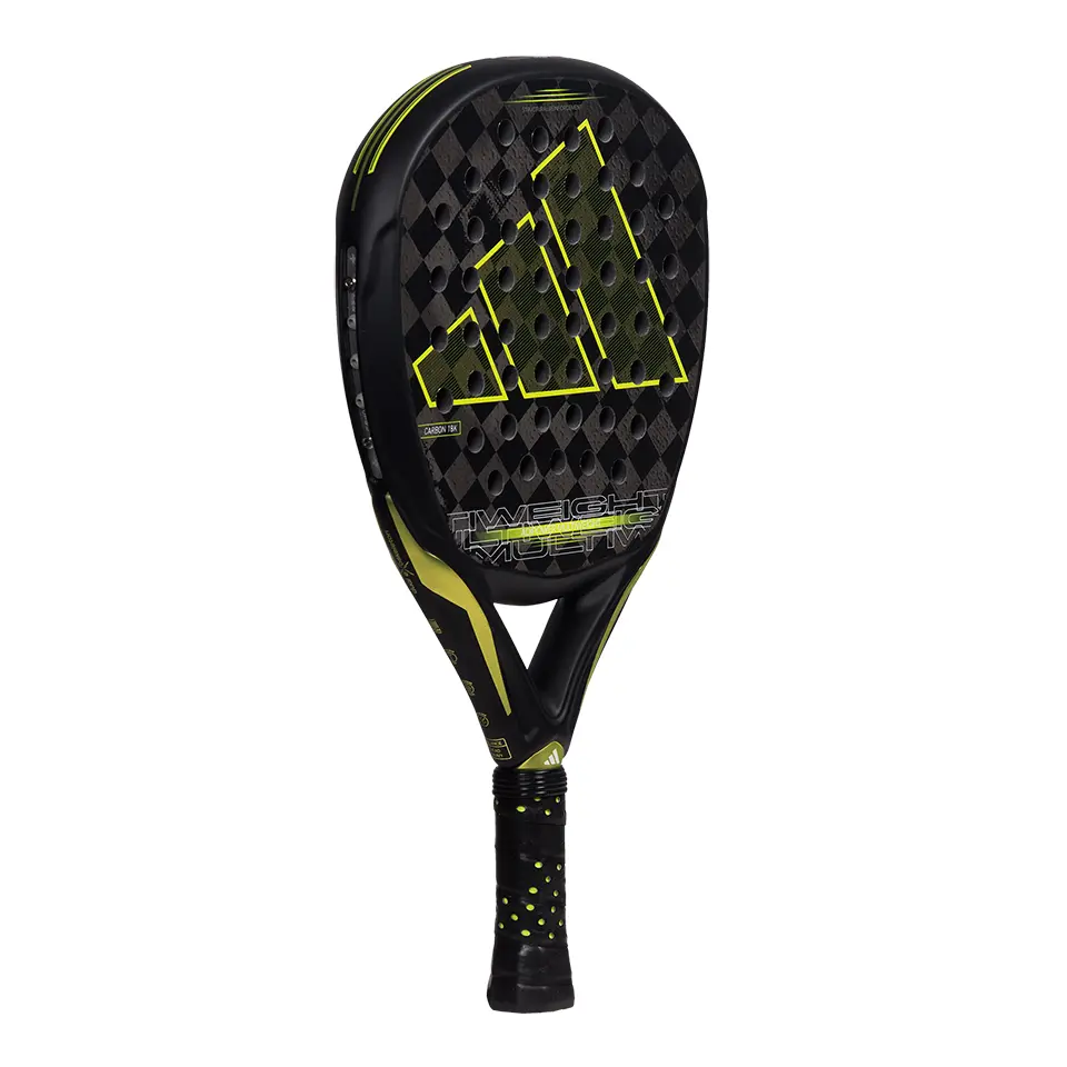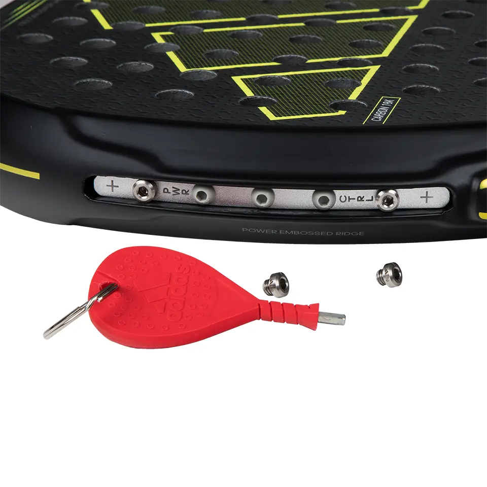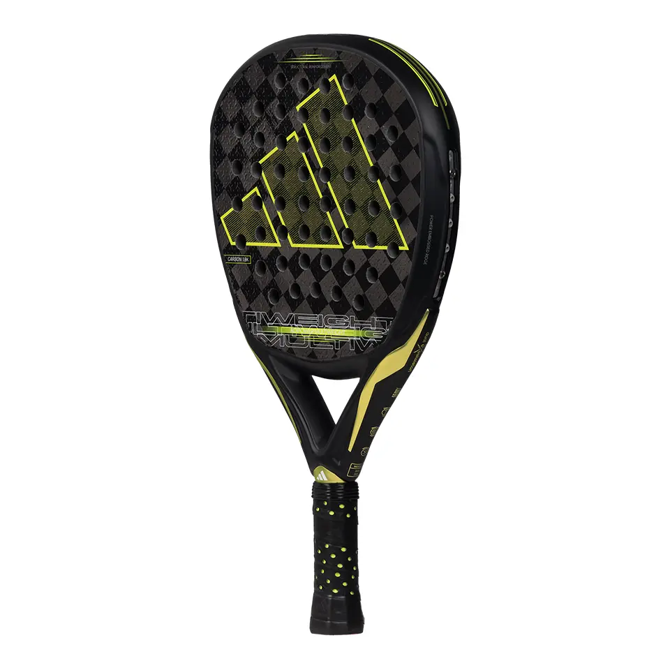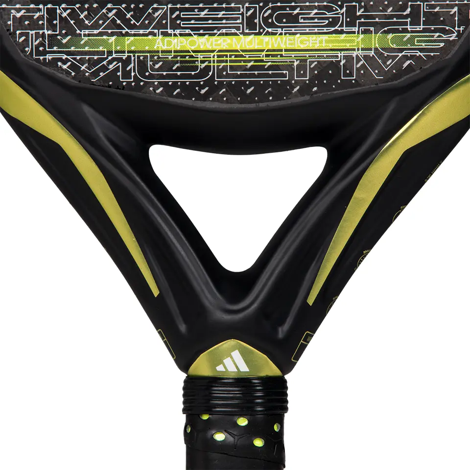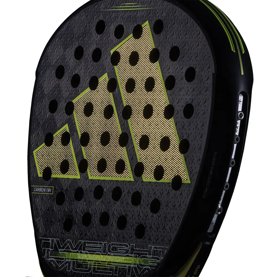 La innovación sigue estando al servicio del talento en la segunda generación de Adipower Multiweight. Esta pala está fabricada pensando en las necesidades de los mejores jugadores de pádel. La tecnología Weight & Balance System permite adaptar la pala a unas condiciones más de control o de ataque mediante la modificación de los pesos y el balance. La superficie de Carbono 18K y el interior de goma Eva High Memory una combinación ideal para encontrar el golpe más potente. El Dual Exoskeleton y el Power Embossed Ridge incorporan nervios de carbono en el corazón y el marco, respectivamente, para un alto nivel de rigidez.