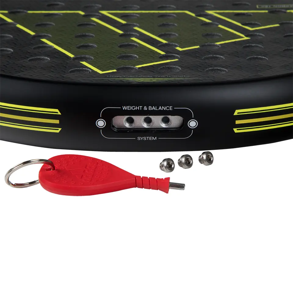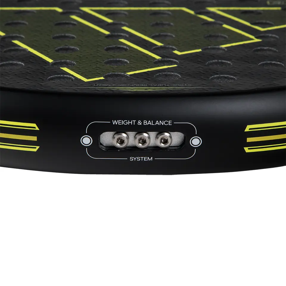 Weigth & Balance System Multiweight: Sistema de pesos ubicado en el rail del canto y cabeza de la pala. Te permite modificar el peso y balance quitando o añadiendo hasta 9 gramos repartidos entre 7 tornillos. Se pueden mover los tornillos entre los 13 agujeros, para adaptar el balance tus necesidades.